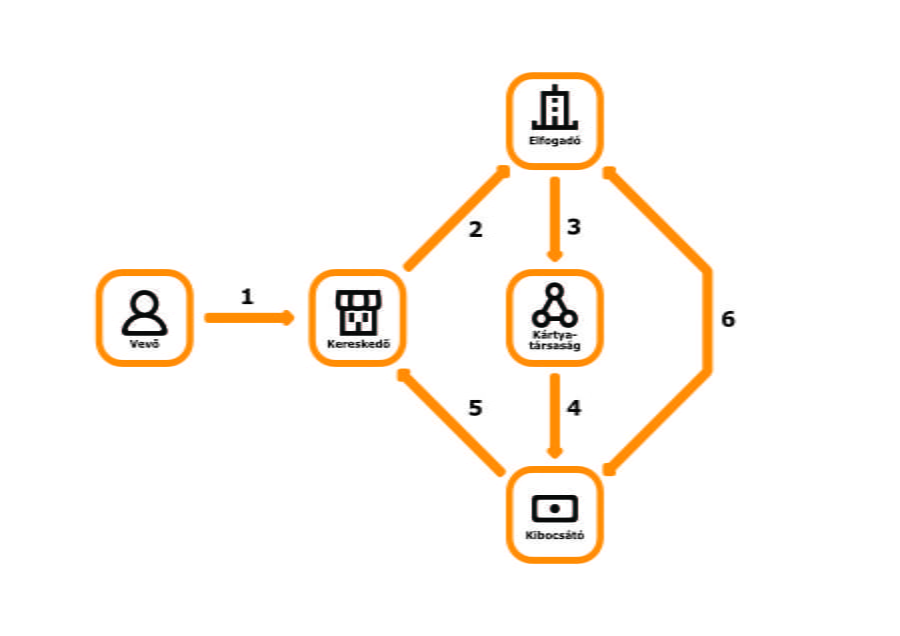 - És végül a kártyatársaság, aki a bankkártyás fizetés során a háttérmunkát végzi, és biztosítja a tranzakciók (vásárlások, készpénzfelvételek) elszámolását a bankok között.
