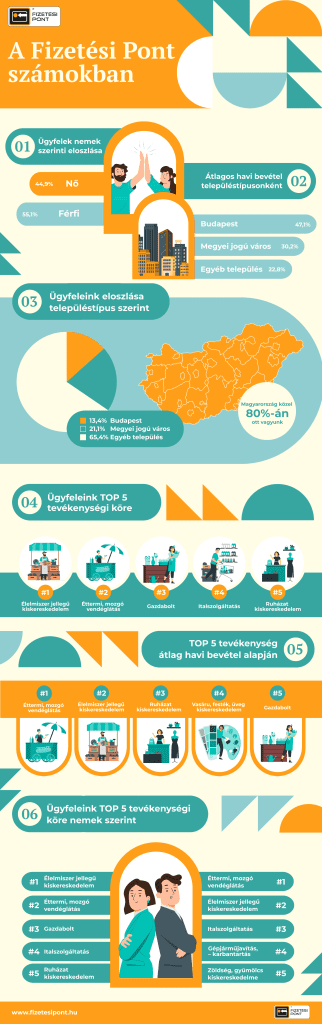 A Fizetési Pont rugalmasságát is kiemeli az infografika. Az egyszerűen telepíthető és használható rendszer nem igényel komoly technikai tudást. Sőt, a terminál telepítésének időpontjában személyesen is elmagyaráznak mindent kollégáink a terminál működésével kapcsolatban. Így bárki könnyedén integrálhatja azt üzleti tevékenységébe. Ez a hozzáférhetőség és rugalmasság teszi lehetővé, hogy a szolgáltatás egyre népszerűbb a hazai kkv-k körében.